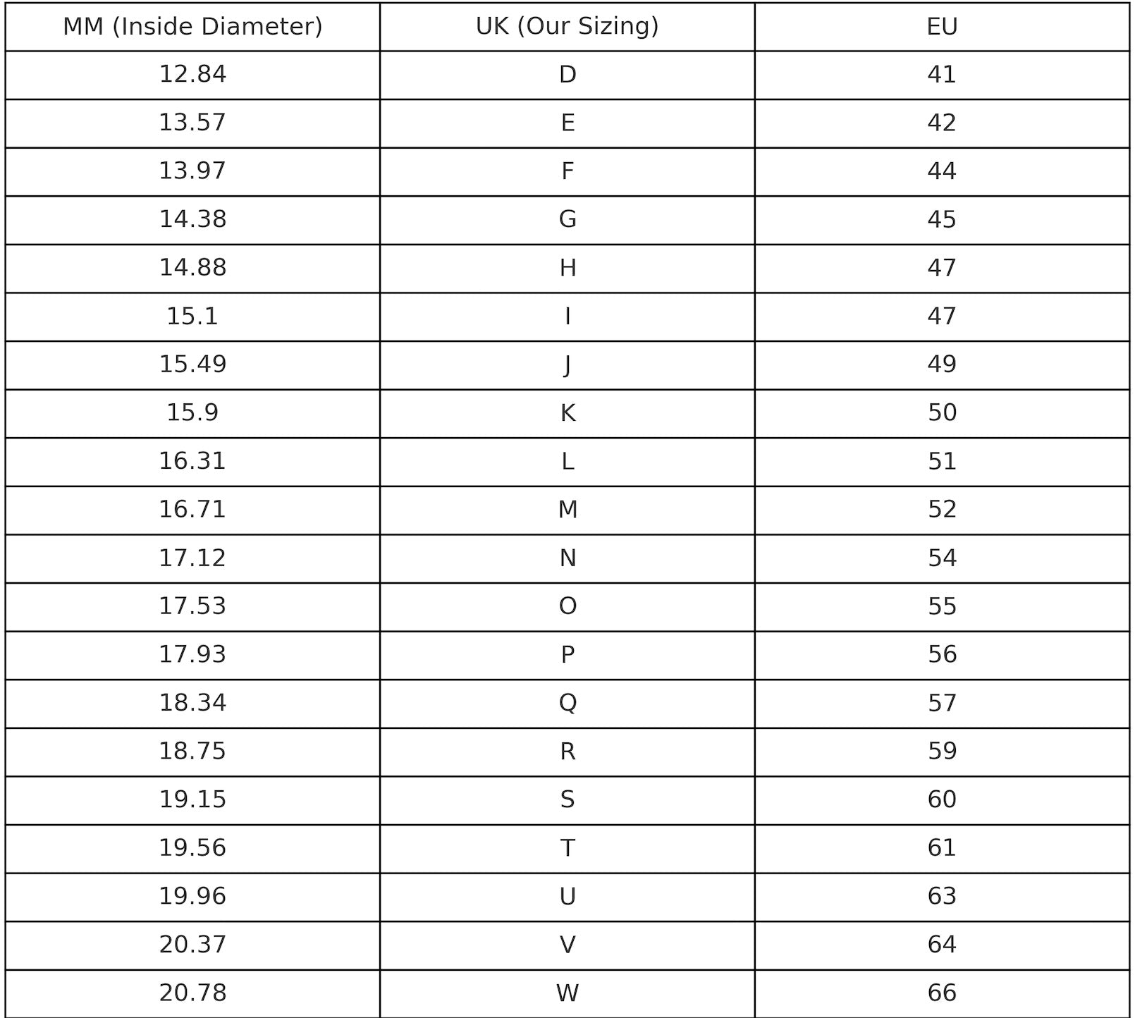 We use the UK ring sizing chart. The easiest way to find your correct size is by using your existing UK or EU ring size. If you're unsure of your size but have a ring at home that fits well, simply measure the inside diameter in millimetres (to the nearest mm) — that measurement will help determine your ring size.